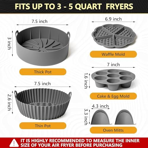 5-Pack Air Fryer Silicone Liners – Include Silicone Mitts, Egg Bites Tray, Waffle Mold, Silicone Cupcake Liners, Pot – Compatible with 3-5 Quart Air Fryers – Reusable, Food-Grade, Dishwasher-Safe