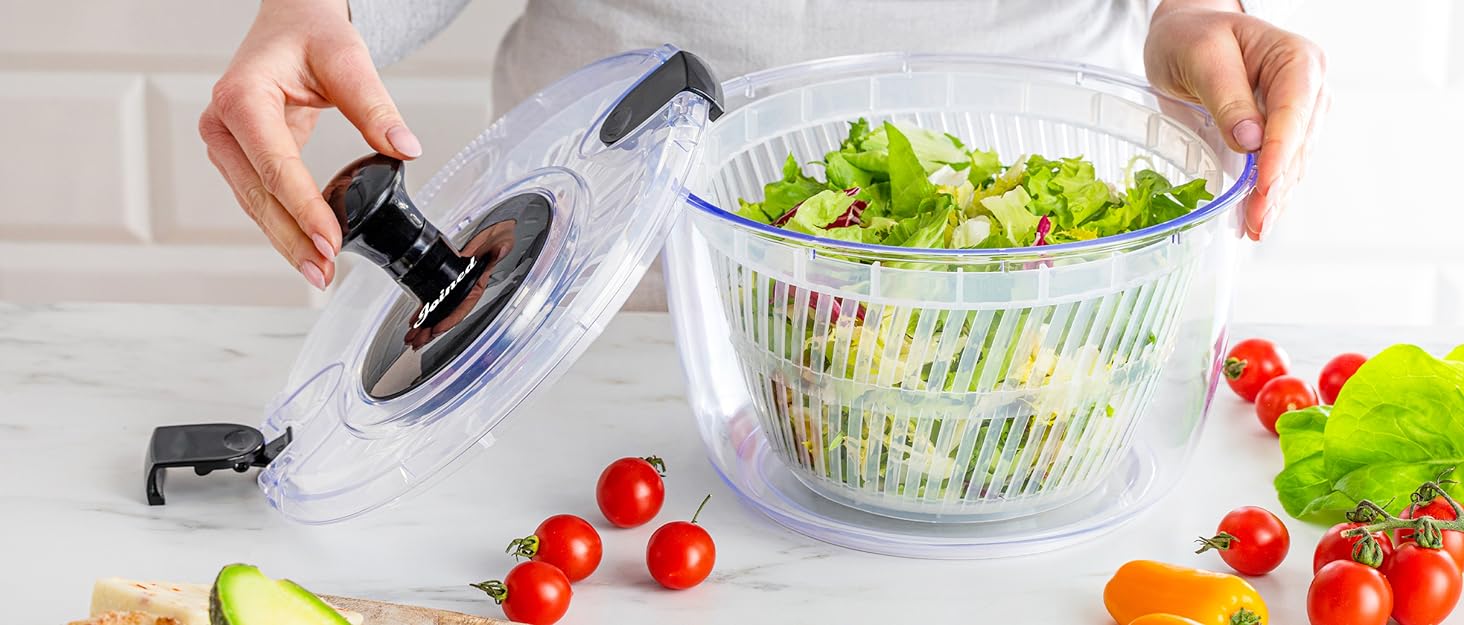 Turn chore into pleasure and make your salads tastier. Forget washing gem lettuce by hand, drying chopped salad with tons of paper towels, spraying water all around the kitchen, and bland, watery salads. Our easy rotary handle makes spinning effortless, so you can enjoy the convenience of a quick, mess-free, and tasty salad.