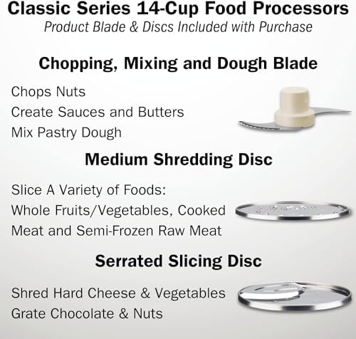 The Cuisinart DFP-14BCNY custom food Processor has an extra-large Feed tube that holds whole fruits and vegetables. Features a 14-Cup work bowl, 4mm stainless steel Medium slicing disc, stainless steel shredding disc, and chopping/mixing blade. Includes a spatula and recipe book.