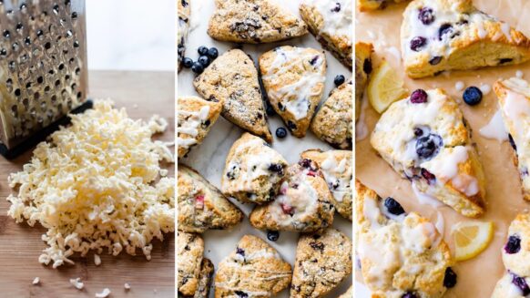 These lemon blueberry scones are bursting with juicy blueberries and delicious lemon zing! They’re buttery and moist with crisp crumbly edges and soft flaky centers topped with a sweet lemon icing.