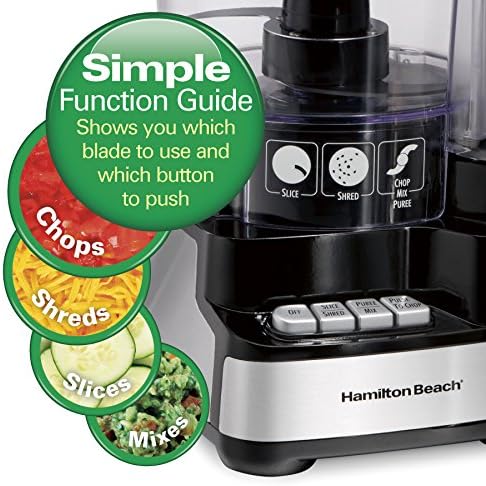 Designed to be uniquely simple, The Hamilton Beach stack & snap 12 cup food processor requires no twisting, turning or locking during assembly. Instead, it’s as easy as stacking the 12 cup bowl onto the base, then snapping on the lid. Easy to use – Disc attachments are reversible and labeled, which takes the guesswork out of processing. The label should face up for the desired function. When using disc attachment, do not process foods past the max level indicator on the bowl. FOOD MAXIMUM AMOUNTTO PROCESS Dry ingredients such as crackers or nuts 12 cups (2.8 L) Vegetables or fruits 3 pounds (1.4 kg) Cheese such as Parmesan or Cheddar 40 ounces (1.2 L) Thick sauces or dips 8 cups (1.9 L) Liquids such as marinades or soups 7 cups (1.7 L).