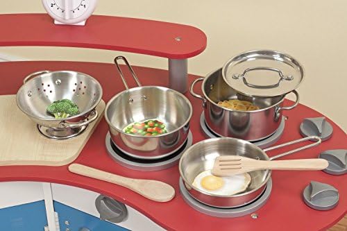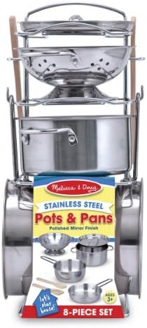 Hand polished stainless steel: The Melissa & doug stainless steel pots & pans play set for kids is an 8 piece stainless steel set including a colander, pot with lid, 2 pans, 2 wooden utensils, and rack