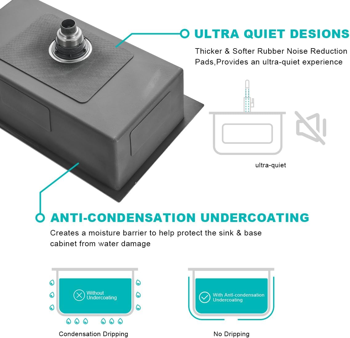 Noise Reduction Design: The stainless sink original Anti-Noise technology with Thick heavy-duty coating and extra-thick rubber padding covering over 95% the sink to absorbs vibration and noise from dish washing and collision friction.