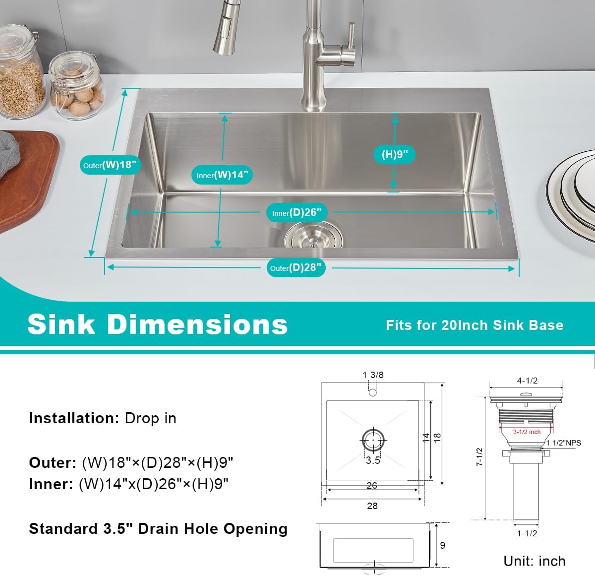 Exterior dimensions: 28″ (wide) x 18″ (front-to-back); Interior bowl dimension: 26″ (wide) x 14″ (front-to-back) x 9″ (bowl depth); Minimum base cabinet size: 30″; Standard 3.5″ drain opening will fit any garbage disposal unit.
