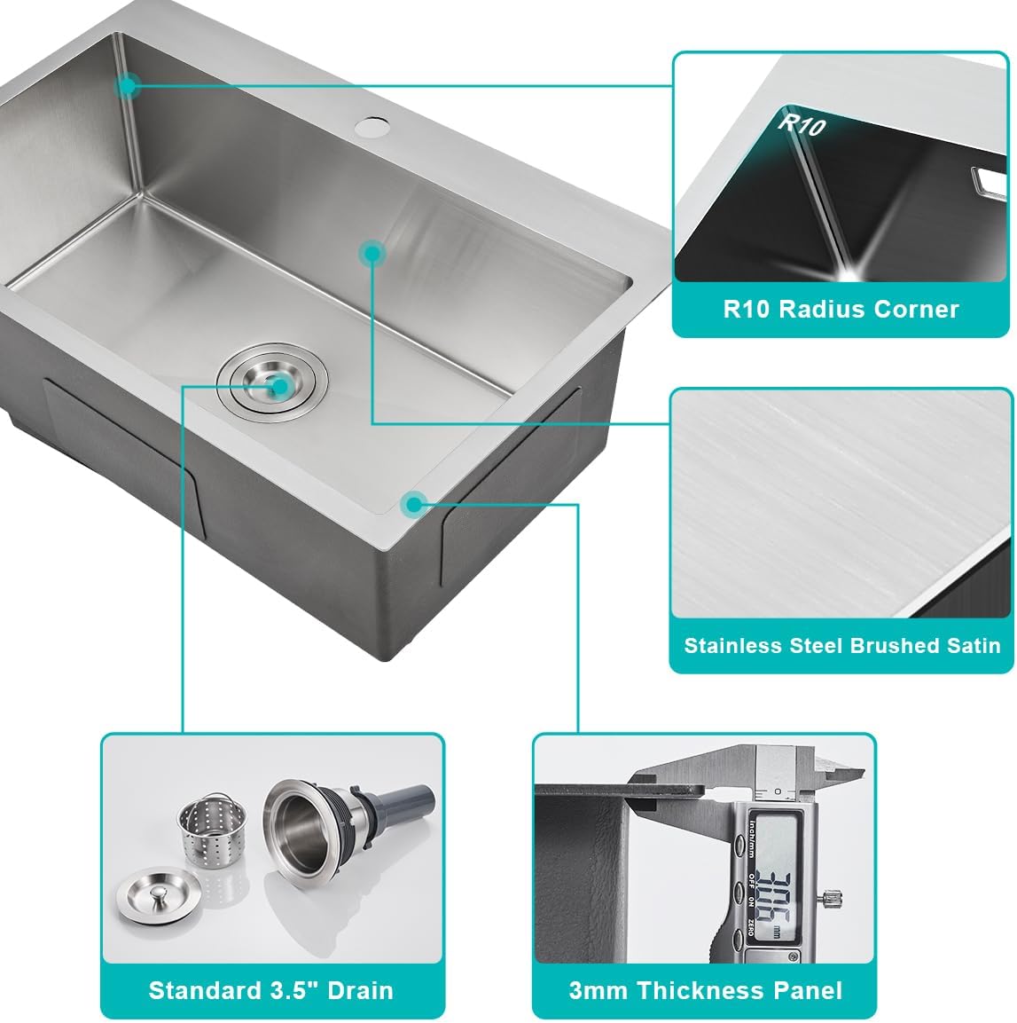 Indestructible Construction: The drop in kitchen sink is constructed of handcrafted T304 stainless steel for the superior durability and dent-resistance. Commercial Grade satin finish, corrosion and rust-resistant, easy to clean and long-lasting.