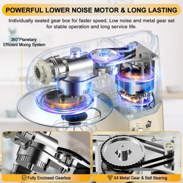🎂𝐓𝐢𝐥𝐭𝐢𝐧𝐠 𝐇𝐞𝐚𝐝 & 𝐍𝐨𝐧-𝐒𝐥𝐢𝐩 𝐃𝐞𝐬𝐢𝐠𝐧:The tilt head design is easy to install and remove bowls and accessories. When the tilt head stops working, it will automatically turn on the power-off protection function. The bottom is equipped with 4 non-slip silicone suction cups to fit the table and keep the machine stable and reduce noise.360°planetary trajectory mixing design makes the mixing more thorough.