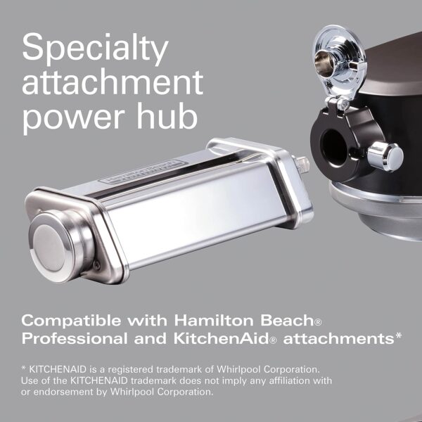 SPECIALTY ATTACHMENT POWER HUB. Add-on attachments can be purchased for making pasta, grinding meat, slicing, shredding and more. Fits stand mixer attachments by Hamilton Beach Professional.