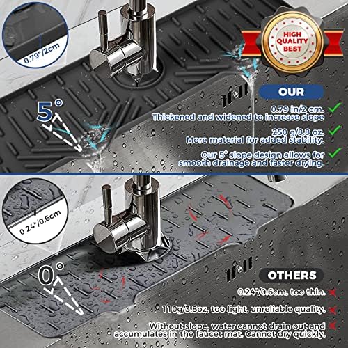 💪【5° UPGRADE VERSION】 Silicone faucet mat with upgraded 5° slope design, the kitchen faucet splash guard allows captured water to flow into the sink faster, resulting in faster drying of the kitchen sink. This means never gets soggy, or not having any water spots by the sink faucet. You don’t need to worry about the water staying on the sink & bathroom counter. Upgrading your kitchen sink & bathroom countertop in an effort-saving way!