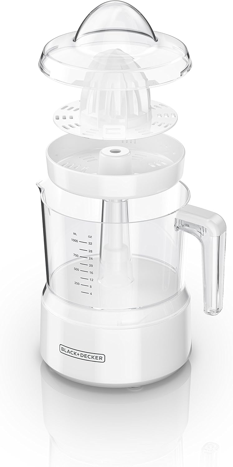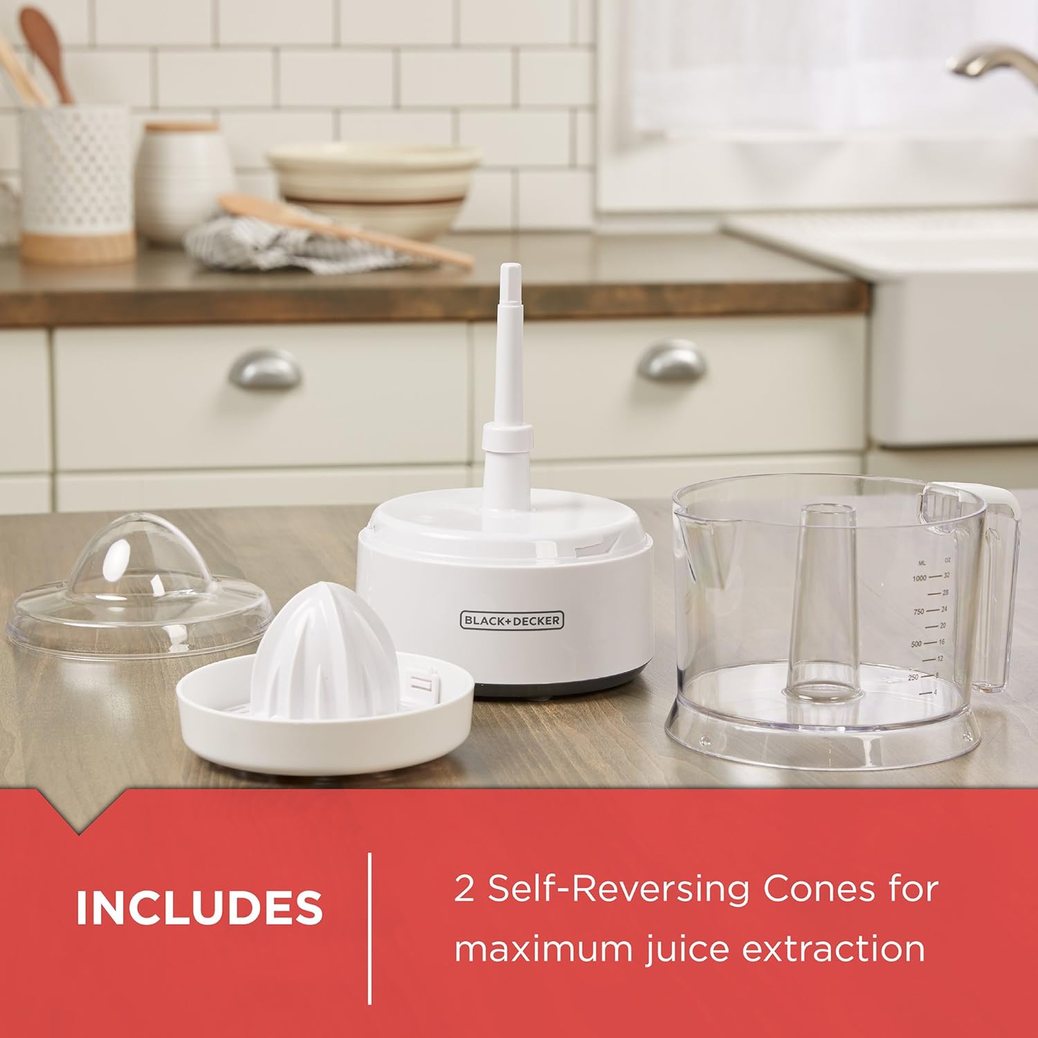 Style Name:Dual-Purpose Juicing Cone Freshly squeezed juice is just a spin away The BLACK+DECKER 32-oz. Citrus Juicer features a dual-purpose, self-reversing cone that ensures maximum juice extraction from large and small citrus! Juice flows into the easy-pour pitcher, which includes measurement markings for accurate use in recipes and mixed drinks. Plus, all removable parts are dishwasher-safe for easy cleanup.