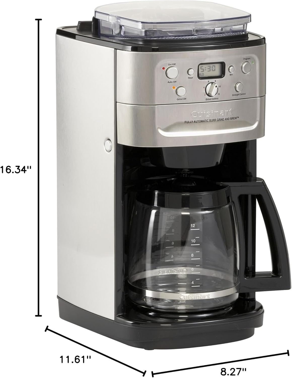 Strength selector and grind control fine-tune intensity and volume, 8-ounce bean hopper, auto shutoff and brew-pause function