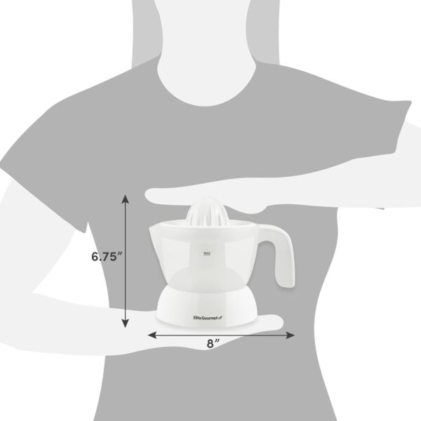 Write 55 words introduction about Elite Gourmet ETS-411 BPA-Free Electric Citrus Juicer Extractor: Compact Large Volume Pulp Control Oranges, Lemons, Limes, Grapefruits with Easy Pour Spout, 16 oz, White