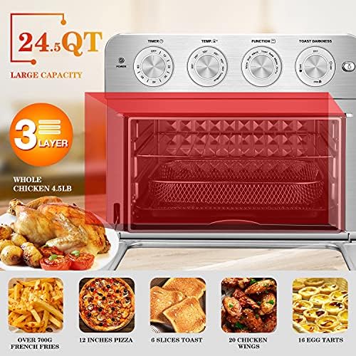 【 Family size&Space saving design】 24.5QT, 3 rack levels allow you to prepare family-size meal for up to 10 people at once, or control how fast and crispy your food cooks. With a large design this air fryer oven can be placed on your countertop or stored away when not in use.Air fries up to 4 lb of food,Toasts 6 slices of bread.