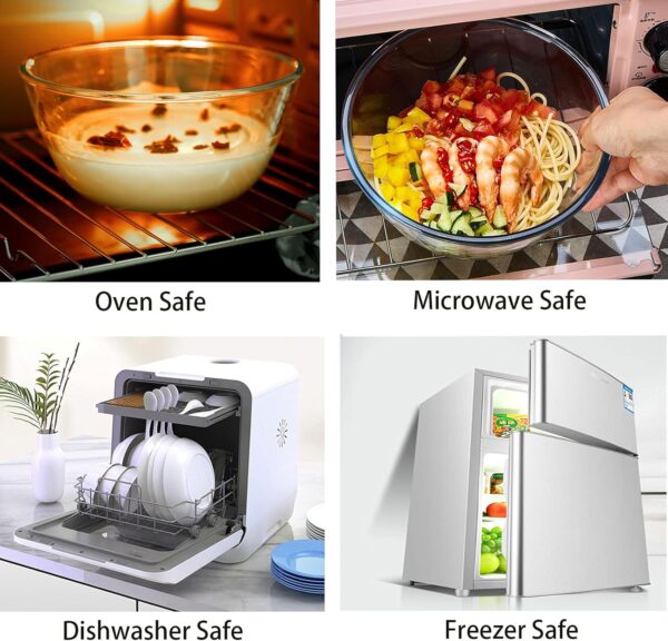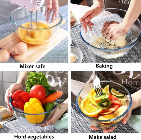【HIGH TEMPERATURE TOLERANCE】The large glass mixing bowl set is made of high bro silicate material, and tolerates -4℉ to 1040℉, access to microwave, oven, fridge and freezer directly.