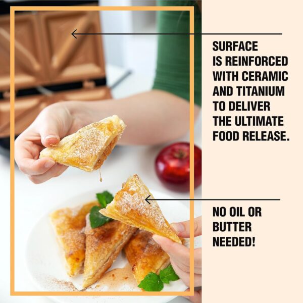 Easy To Use: The Gotham Steel sandwich maker is designed for easy use for all ages and makes four perfectly toasted pocket sandwiches in less than 5 minutes, start to finish.