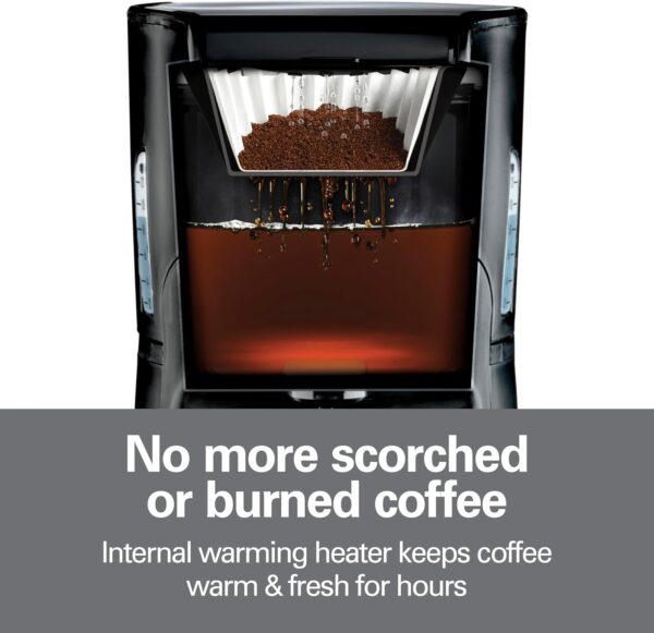 NO MORE SCORCHED OR BURNED COFFEE: The Hamilton Beach coffee maker’s internal warming heater keeps coffee warm and fresh for hours. It works without a carafe, so coffee won’t burn or scorch.