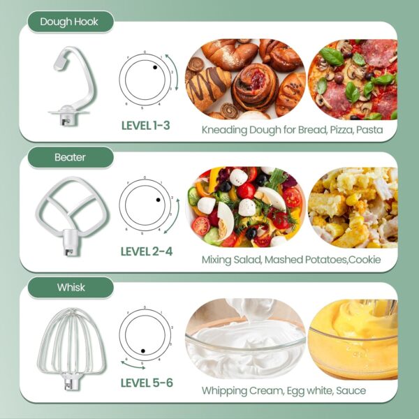 【Humanized Design】6QT large capacity stainless steel bowl. Splash guard keeps kitchen clean and won’t make a mess. You can add ingredients to the bowl through it. Tilt head is easy to install or remove bowls and accessories. 4 non slip silicone suction cups can firmly suck on the table, keeping the household kitchen mixer stable and reducing noise.