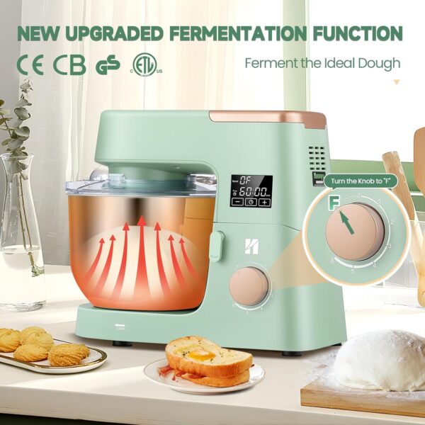 【Excellent Performance】New upgraded fermentation function! Turn the Knob to “F”, Huanyu standing mixer will produce the right fermentation temperature to help you ferment the ideal dough. 360° trajectory planetary mixing allows for complete and thorough mixing. Powerful 660W pure copper motor. Faster speed longer service life. Overheat protection function, safe and reliable.