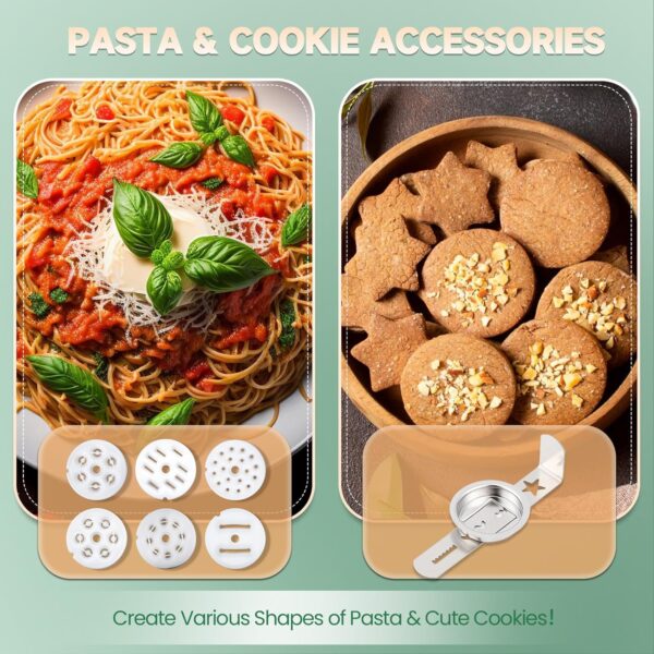 【9 in 1 Stand Mixer】Huanyu Kitchen Stand Mixer is a multifunctional food processor. Equipped with dough hook, beater, and whisk. It is also a meat grinder, sausage maker, vegetable slicer, and fruit juicer. Using pasta and cookie accessories, you can create various shapes of pasta and cute cookies. We also offer you a silicone spatula and an egg separator as gifts.