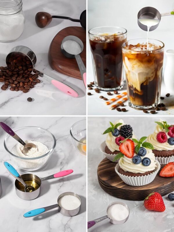 Made from durable stainless steel, these measuring cups and spoons are built to last. The soft touch silicone handles provide a comfortable grip while measuring dry and liquid ingredients.