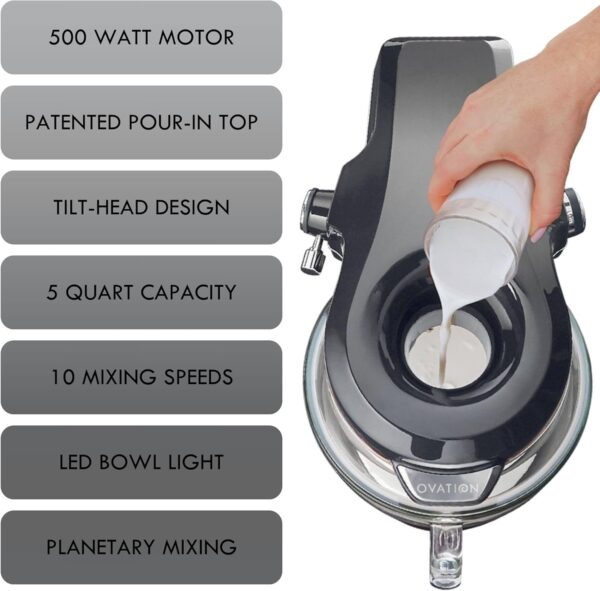INNOVATIVE POUR-IN TOP – The Ovation’s electric stand mixer patented pour-in design lets you add ingredients to the mixing bowl without stopping or splattering while the unique 360-degree splash guard keeps ingredients in the bowl and off your countertop