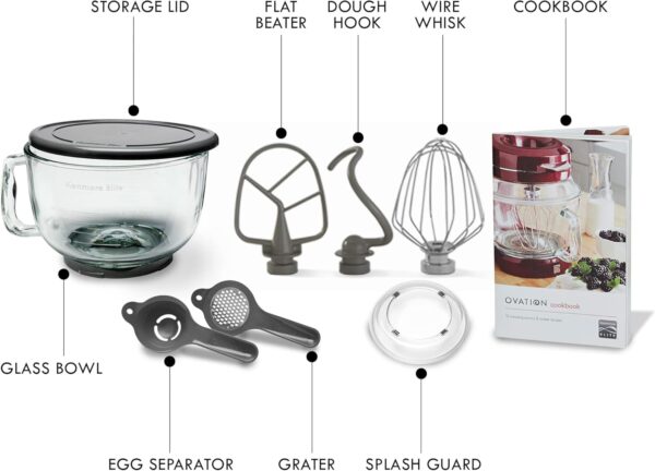 INCLUDES EXCLUSIVE ACCESSORIES : Kenmore household stand mixers come with interchangeable flat beater, dough maker hook and wire whisk; 5 qt glass bowl with storage lid; and wide-mouth funnel, egg separator, and ingredient grater/zester designed to fit the Ovation’s pour-in opening