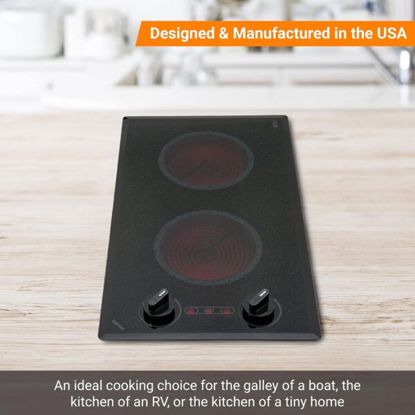 Designed to cater to modern chefs and passionate home cooks, this electric cooktop features two powerful 6.5″ burners, allowing you to cook multiple dishes simultaneously. With its elegant black color and the ability to handle a maximum 2400-Watt load, this cooktop delivers high heat for flawless results. Whether you’re in a boat galley, an RV kitchen, or a cozy tiny home, this cooktop enhances your culinary potential in any space.