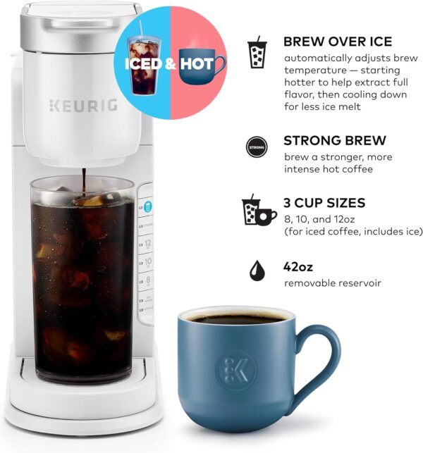 The Keurig® K-Iced™ coffee maker. Enjoy refreshingly delicious iced coffee and full-flavored hot coffee from one multitalented coffee maker. Brew the perfect coffee for any craving, mood, or mouthwatering moment. Always easy, always right. It’s all in the, blue Brew Over Ice button. One push, and the K-Iced™ coffee maker automatically adjusts the brew temperature, starting hotter to extract full flavor, then cooling down to minimize ice melt. All for a vibrant, balanced iced coffee that never tastes watered down. The K-Iced™ coffee maker also brews the same full-flavored hot coffee that you love. And if you want a stronger cup, the Strong Brew setting gives your hot coffee a bolder, more intense taste. Whether you’re brewing iced or hot, choose from 3 cup sizes — 8, 10, and 12oz (for iced coffee, including ice). And the 42oz removable reservoir lets you enjoy multiple deliciously refreshing cups between refills.