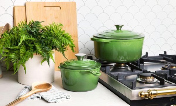 In addition to being durable and versatile, the Larder & Vine 5-Piece Enameled Cast Iron Cookware Set is also incredibly stylish. The Okra color is a beautiful shade of green that will brighten up any kitchen. The sleek design and smooth finish of this cookware set make it a standout piece that you’ll be proud to display on your stovetop.