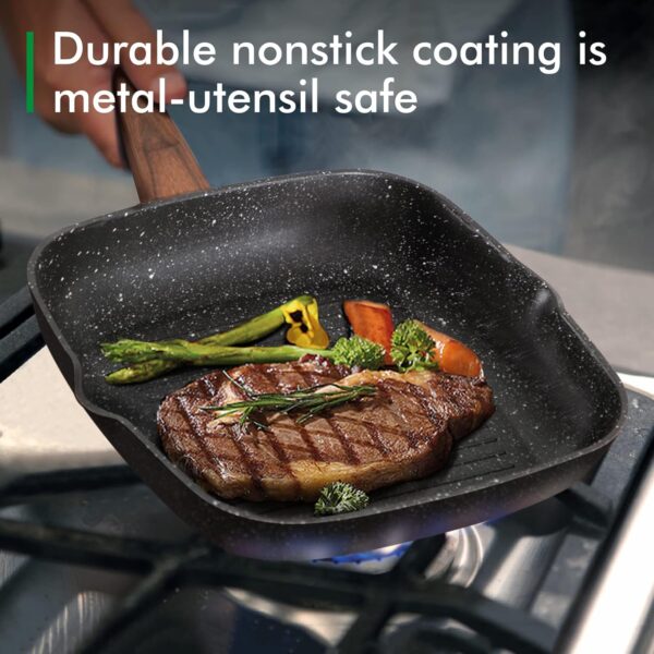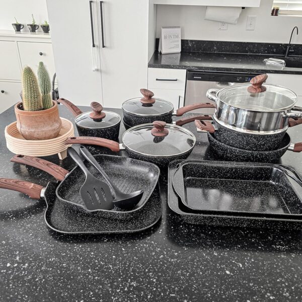 Nonstick Granite Stone Coating: The pots and pans set features a durable granite stone coating that ensures easy food release and quick cleanup. The coating is also scratch-resistant and safe for use with metal utensils