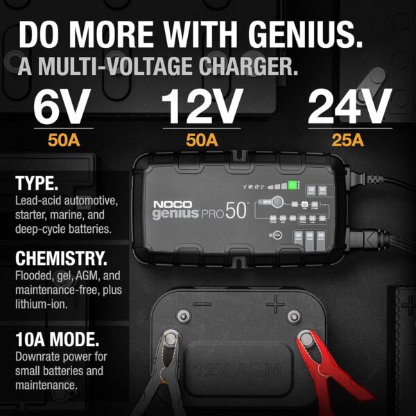 Do more with Genius – A multi-voltage charger – 6-volt (50-amps), 12-volt (50-amps), and 24-volt (25-amps) – for lead-acid automotive, marine, RV, and deep-cycle batteries, including flooded, gel, AGM, SLA, VRLA and maintenance-free, plus lithium-ion (lifepo4) batteries.