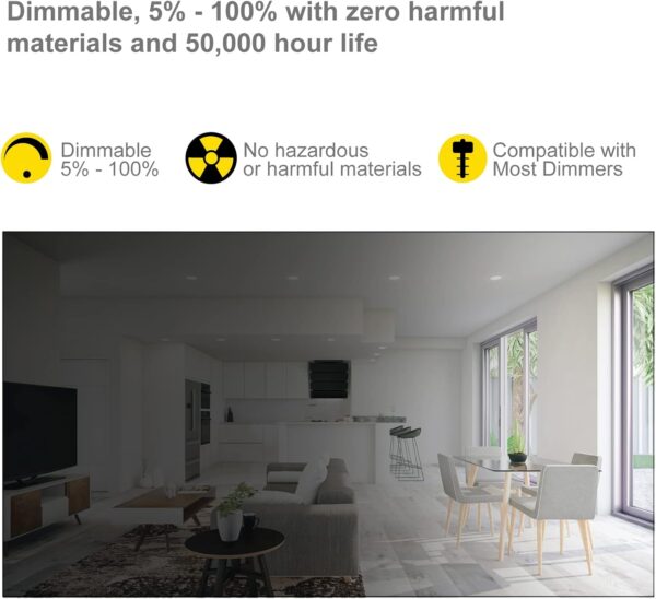 DIM AS YOU SEE FIT: This light is compatible with the majority of LED dimmers on the market and can smoothly dim from 5% to 100%, allowing it to fit a wide range of lighting applications such as in Kitchens, Living Rooms, Bedrooms, Bathrooms, and Patio Lighting using 120V AC.