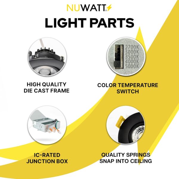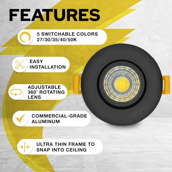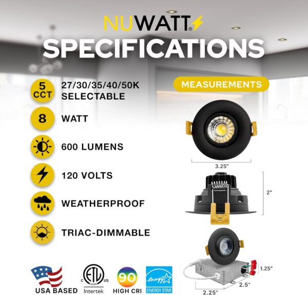 The NUWATT 3 Inch Round Black LED Gimbal Recessed Downlight comes packed with features that make it stand out from the competition. With a color temperature switch ranging from 2700K to 5000K, you can easily adjust the lighting to suit your mood or task at hand.