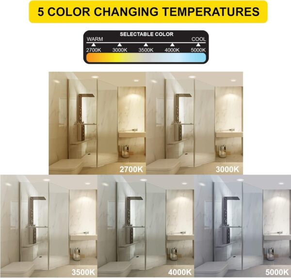COLOR CHANGING: Our recessed LED ceiling light features 5-in-1 CCT options, which allow you to toggle between 2700K soft white, 3000K warm white, 3500K neutral white, 4000K cool white, and 5000K daylight. Choose from soft to daylight with a flick of a switch and a consistent flux of 600 lumens.