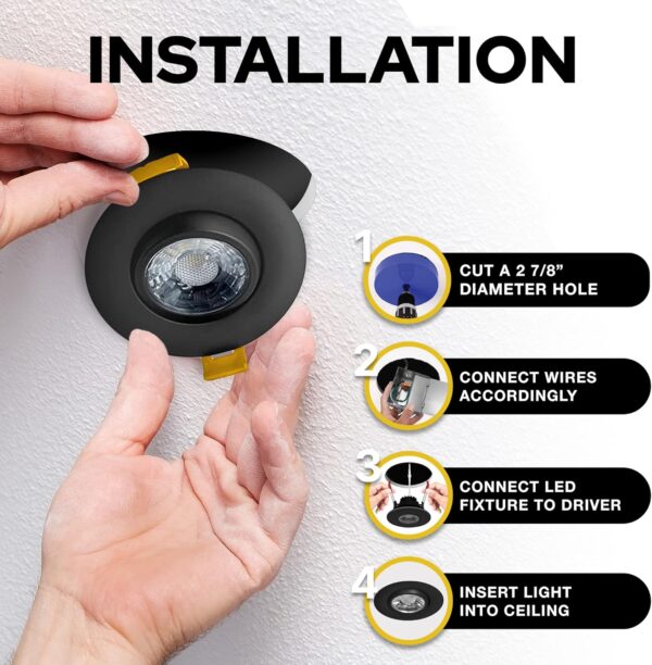 CANLESS INSTALLATION: Easily place into shallow ceilings without a can. Our 3″ recessed light includes an integrated IC-rated junction box, mount holes, Snap In Clips to fit in double drywall ceilings, 3 knockouts in the J-box for easy installation, and water-resistant twist connectors to fit any application including, but not limited to showers, outdoor soffits, residential buildings, outdoor lighting, or lighting for commercial buildings.