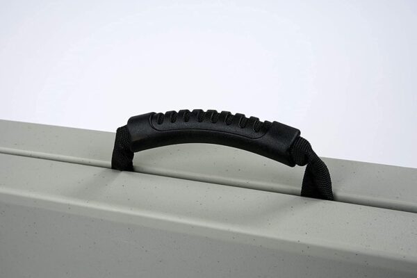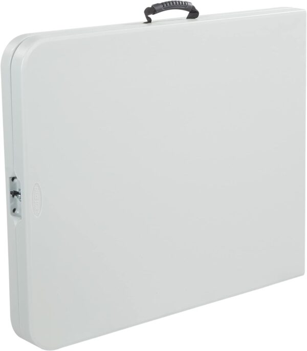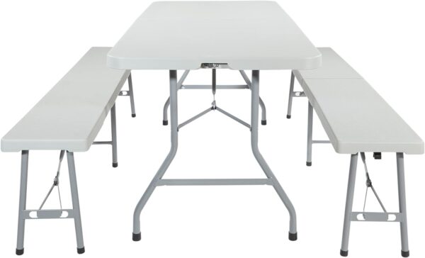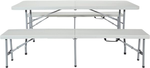 With its durable, heavy-duty blow-mold light grey resin construction, this lightweight set contains 2 fold-in-half benches and a 6′ fold in half table