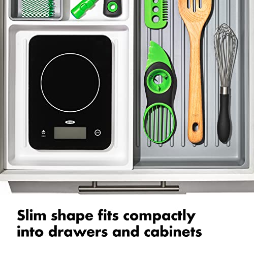 Achieving precise measurements whether cooking, baking or portioning out meals, just got easier with the OXO Good Grips 11 lb/5kg Everyday Glass Food Scale. We gave this digital glass scale a slim design so it takes up less work space, while still giving it all the bell and whistles needed to give you accurate results. The tare function makes zeroing out ingredients a snap, so you can feel confident as you work your way through a recipe. We also made sure to include easy universal unit conversion (oz/lb/g/kg/ml) and a large, backlit display for easy reading. Four AAA batteries included.