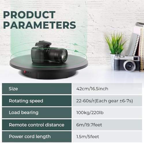 PERFECT TO SHOWCASE LARGER ITEMS – Our 16.5inch product turntable has a load capacity of 220lb/100kg with the speed range 22-60 sec/rev. The size is perfect for larger items photography, even you can use this with an adult sized mannequin (or a light weight adult model) do a 360 degress detailed display!