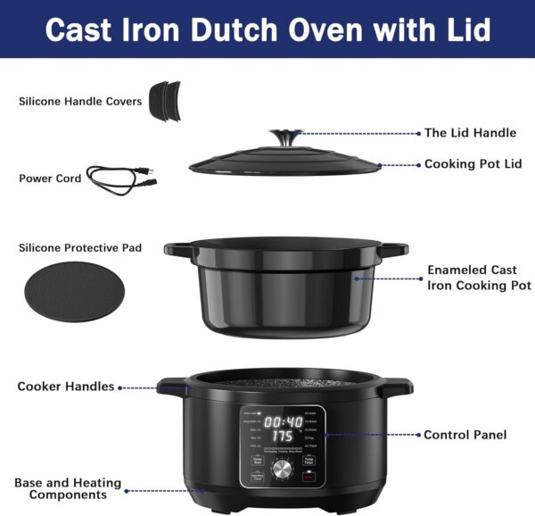 【Perfect Gift】: Cast iron Dutch oven pot with lid adds an upscale feel to many kitchen decor styles and could be widely used in the kitchen. Dutch oven pot with lid cast iron will be a great gift choice for your family and friends. Your friends or loved ones will be unable to resist this charming gift. An electric Dutch oven will add a warm atmosphere to your home, slow cooker is also the best gift for a new home, birthday, wedding, Halloween, Christmas, etc.