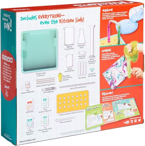25-PIECE KIT EVEN INCLUDES THE KITCHEN SINK: Kitchen Sink of Science, Kitchen Science Shelf of Activity (fits into the Sink), large beaker (400 mL), Erlenmyer flask, petri dish, graduated cylinder (60 mL), small beaker (120 mL), test tubes, pipette (160 mm), funnel, balloon, plastic tubing (30 cm), syringe (10 mL), stirring sticks, pH strips, sodium alginate (10 g), jelly balls polymer (10g), glow-in-the-dark powder (1 g), and 36-page illustrated book packed with experiments