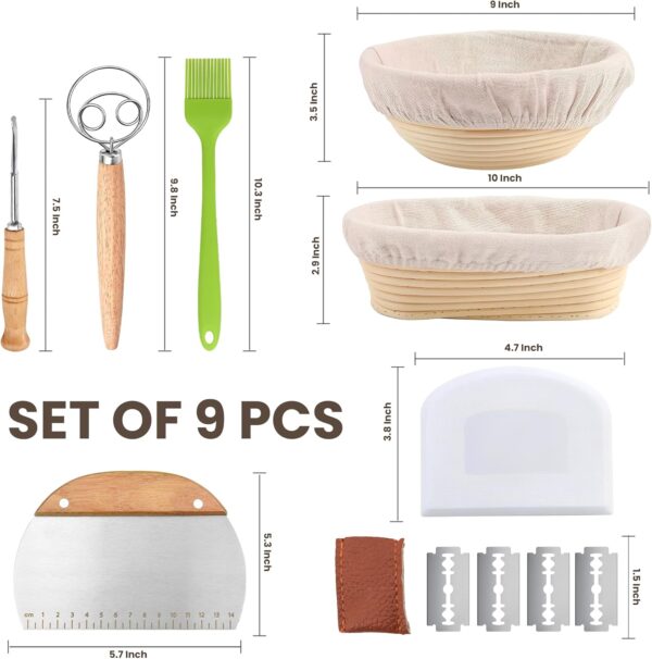 🍞【COMPLETE SOURDOUGH BREAD MAKING ADVENTURE】: Elevate your baking with our comprehensive set, featuring 2 proofing baskets (9″ & 10″), 2 dough scrapers, a Danish dough whisk, a bread lame, a cooking brush, and 2 bread basket liners. All the tools you need for a seamless sourdough experience.