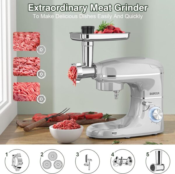 🎂 6-in-1 KITCHEN MIXERS: Babroun kitchen stand mixer is a multi-functional food processor. It is equipped with a dough hook, whisk, beater, juice blender, meat grinder, noodle mould. Easy to make all kinds of food, ranging from bread dough, thick batters, meringues, to whipping cream. At the same time easy to juice and make milkshakes, smoothies and easy to chop meat.