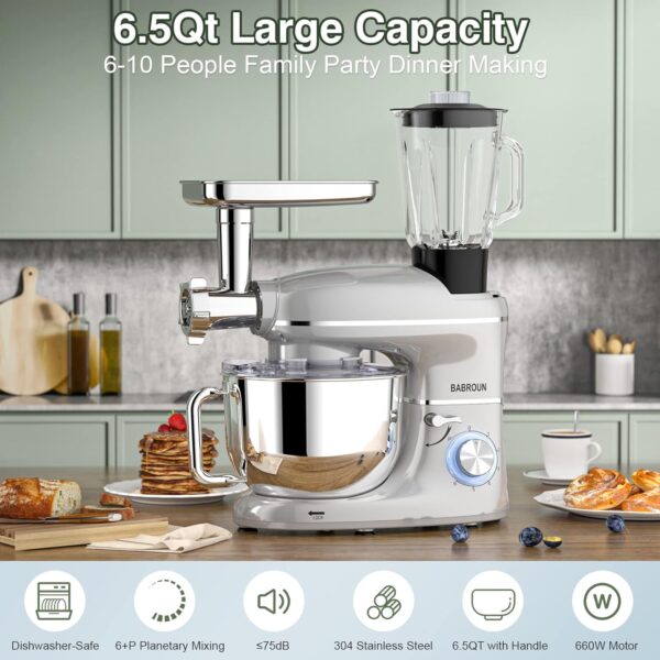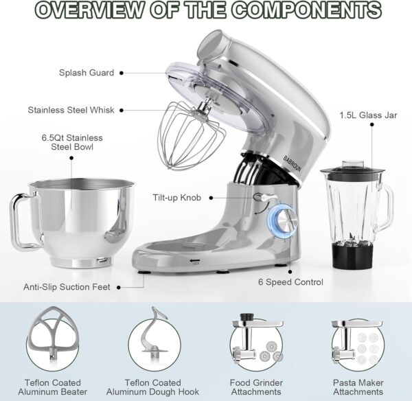 The Stand Mixer, BABROUN 6 IN 1 is a high-end kitchen appliance designed for professional bakers. This multifunctional electric mixer boasts a 6.5QT stainless steel bowl, 1.5L glass jar, meat grinder, dough hook, whisk, beater, and 6 adjustable speeds.