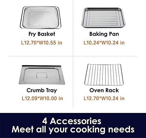 【19 Quart Capacity to Feed the Whole Family】This toaster oven boasts a spacious interior with dimensions of 12.5 x 12.7 x 7.5 inches, making it perfect for cooking a variety of dishes. It can fit up to 2.7 pounds of chicken, 18 egg tarts, 16 chicken wings, a 10-inch pizza, 1.77 pounds of French fries, or 2 pieces of 8-ounce steak. Plus, it comes equipped with four accessories – a baking pan, oven rack, fry basket, and crumb tray – so you can start cooking your favorite meals right away.