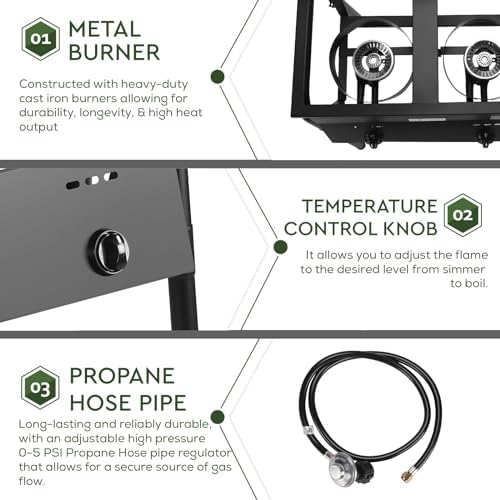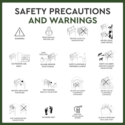 Ultimate Outdoor Frying Companion: Enjoy hassle-free frying with our outdoor fryer. Its adjustable height and detachable legs provide convenience. This propane fryer tanks holds 1.2 to 1.5 gallons of oil, powered by high-output cast iron burners for optimal performance