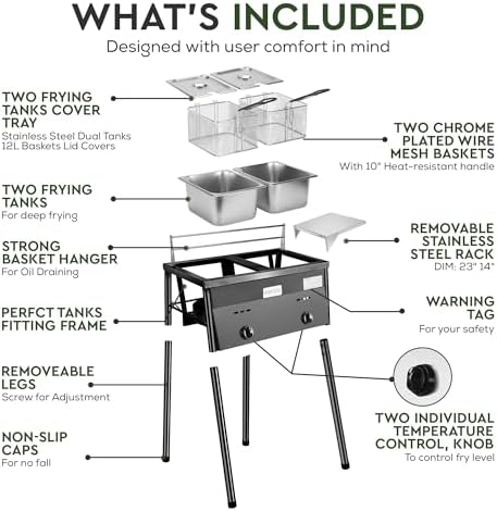 Culinary Excellence Unleashed: Achieve perfection with our fish fryers outdoor cooking two oil tanks, accompanied by tank lids, a stainless steel rack, and two wire mesh baskets. Efficient draining ensures flawlessly cooked snacks every time