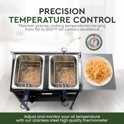 The Two-Tank Outdoor Deep Fryer with Thermometer Fish Fryer is the perfect addition to any backyard cookout or camping trip. This CSA Certified Propane Deep Fryer comes equipped with 2 stainless steel baskets and lids, allowing you to fry up all your favorite foods with ease. The adjustable temperature regulator ensures that your food is cooked to perfection every time.