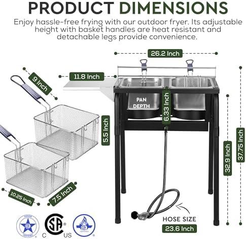 Are you looking for a top-of-the-line outdoor deep fryer for your next backyard barbecue? Look no further than the Two-Tank Outdoor Deep Fryer with Thermometer Fish Fryer. This CSA certified propane deep fryer is equipped with two stainless steel baskets and lids, making it perfect for cooking up a variety of delicious fried foods.