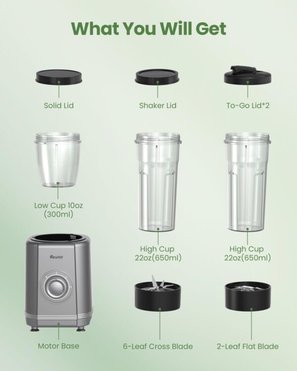Compact & Portable Design: The VEWIOR smoothie blender comes with 2*22oz BPA-free cups, 1 grinding cup (10oz),2*To-Go lids,1*shark lid. Portable design, can be placed in car cup holder, gym, school or backpack, replacing high-sugar soft drinks. The compact design saves a lot of countertop space, making it an ideal small blender for home or office.