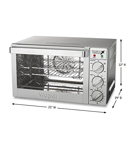 Get four cooking methods in one with the Waring® WCO250X Quarter-Size Convection Oven. Convection bake, roast, bake and broil all in one place. Heavy-duty, brushed stainless steel construction easily handles roasts, pizzas, pies, breads and more. Its double-pane, tempered glass door gives good visibility. This heavy-duty convection oven weathers the most challenging cooking environments and is still easy to clean.